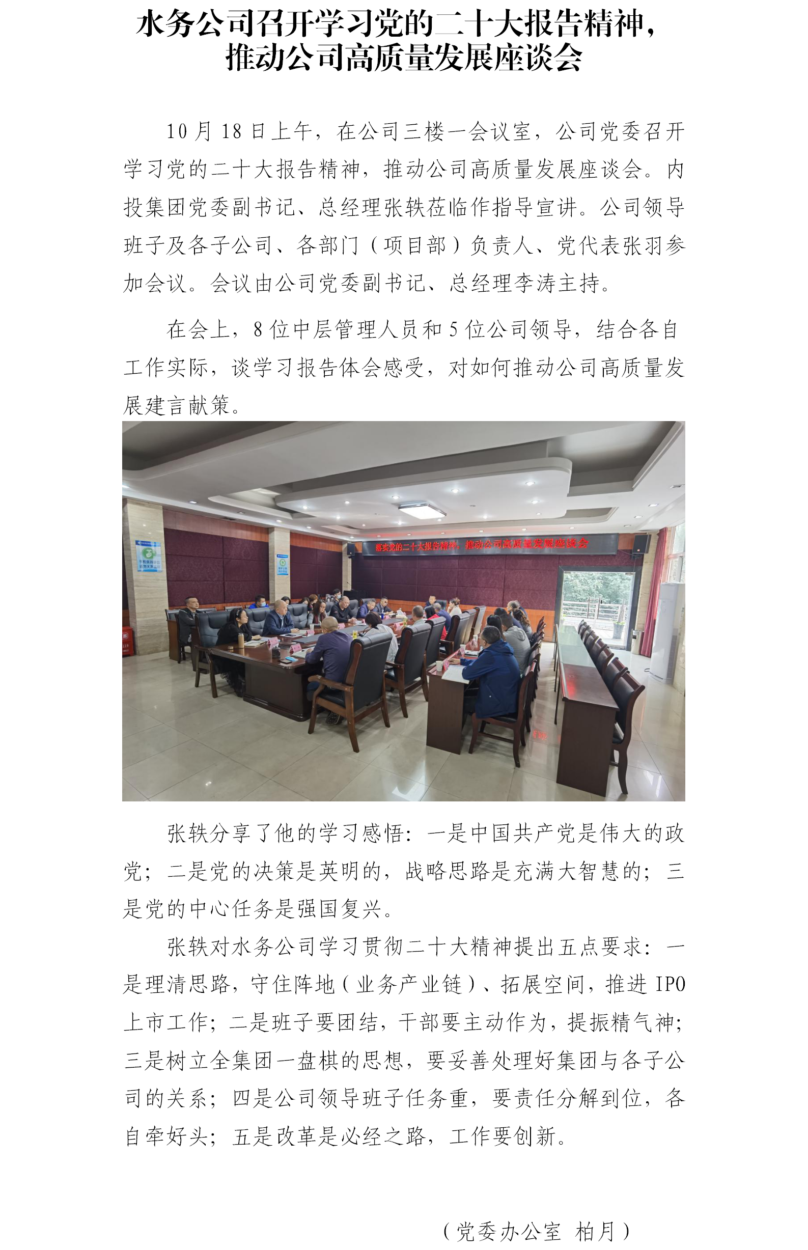 水務公司召開學習黨的二十大報告精神, 推動公司高質(zhì)量發(fā)展座談會