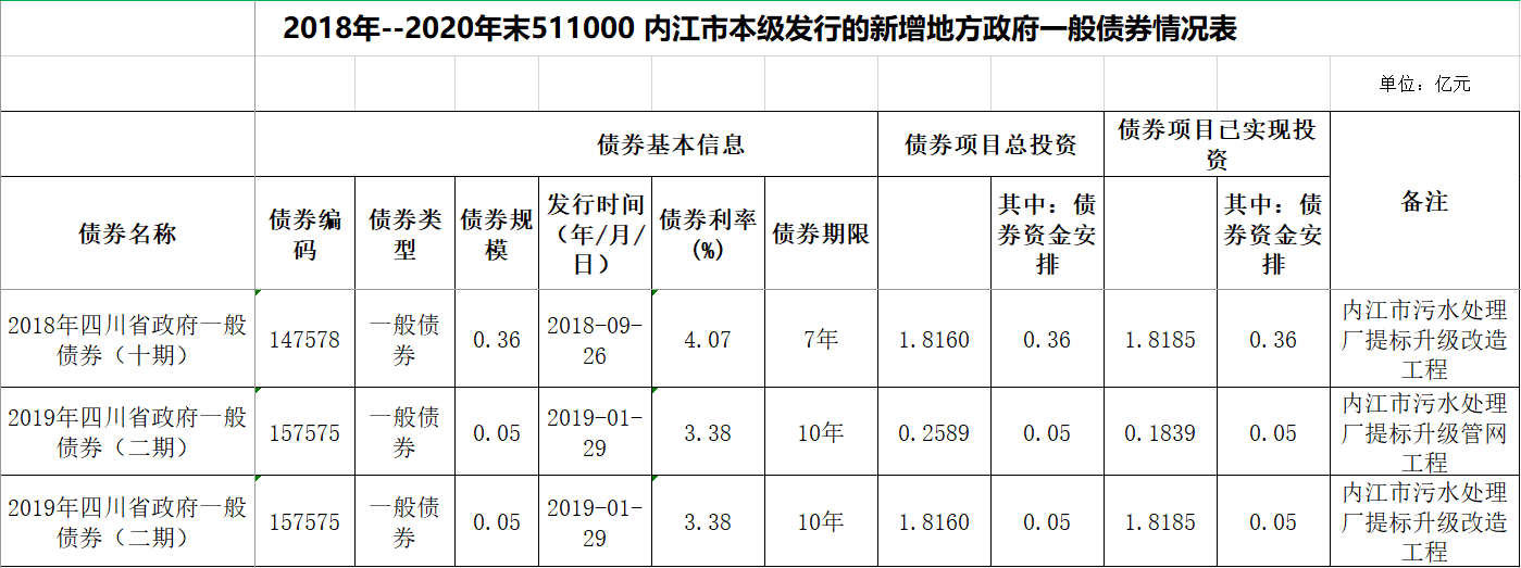 2018年-2020年末511000內(nèi)江市本級(jí)發(fā)行的新增地方政府一般債券情況表