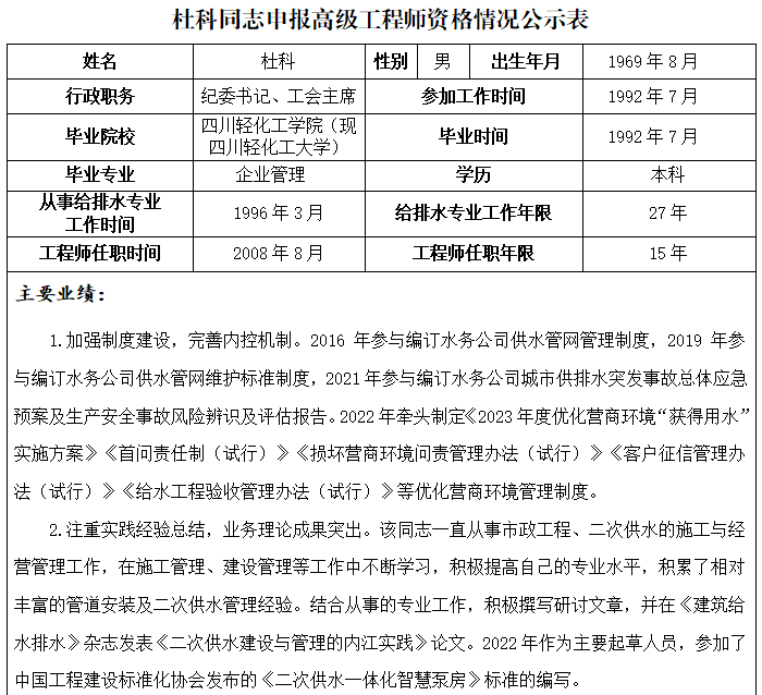 根據《四川省建設工程技術人員職稱申報評審基本條件》(川建行規〔20233號)的規定,經審查,杜科同志符合申報條件。為體現公開、公平、公正原則,接受社會公眾監督,現將其個人基本情況等材料予以公示,公示期為2023107日至10月11日。如有不同意見,請于公示期內,以書面形式向公司人力資源部反映。