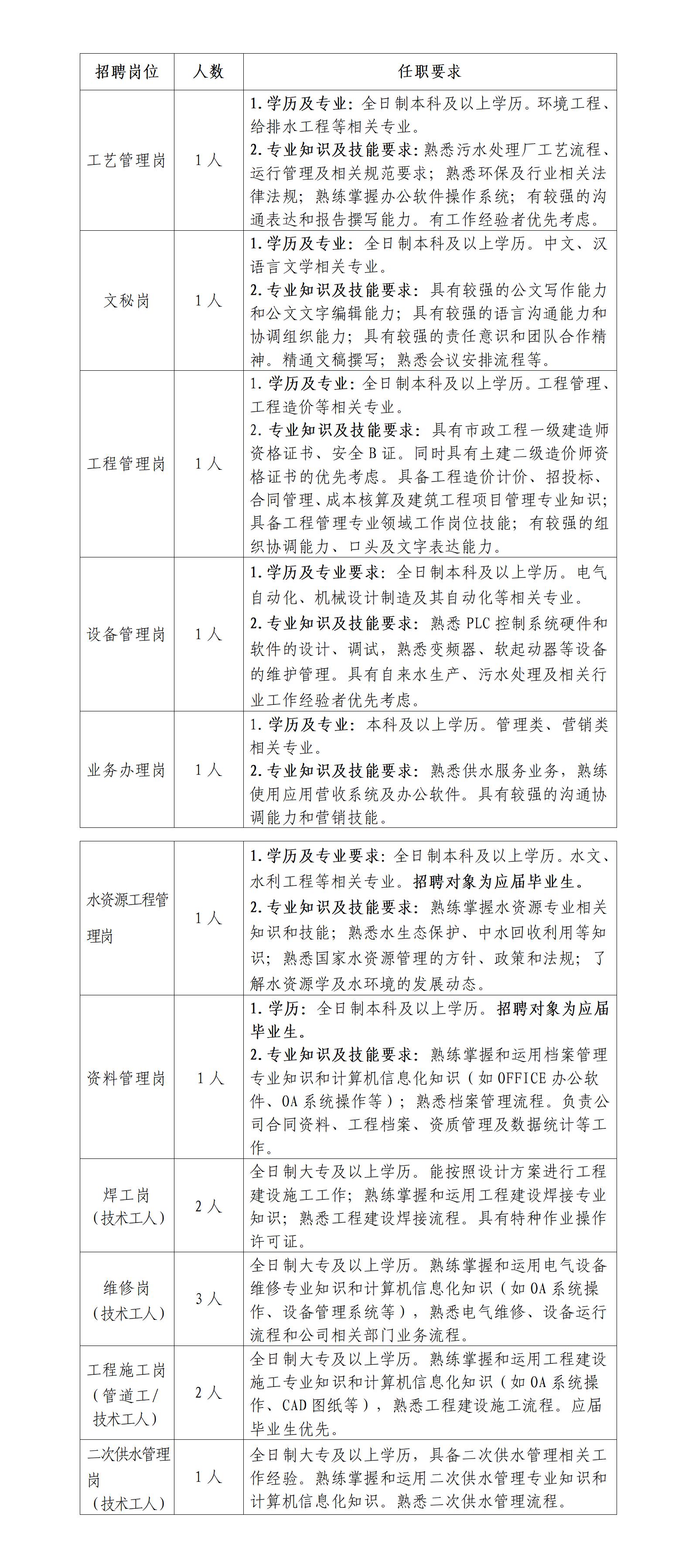 內(nèi)江市水務(wù)有限責(zé)任公司系內(nèi)江市國(guó)資委所屬內(nèi)江投資控股集團(tuán)有限公司的全資子公司。是集城市供水、污水處理、供排水工程設(shè)計(jì)、工程施工為一體的國(guó)有獨(dú)資市政公用骨干企業(yè)。為滿足公司高質(zhì)量發(fā)展對(duì)人才的需求,特面向社會(huì)公開招聘相關(guān)人員。現(xiàn)將招聘事項(xiàng)公告如下。