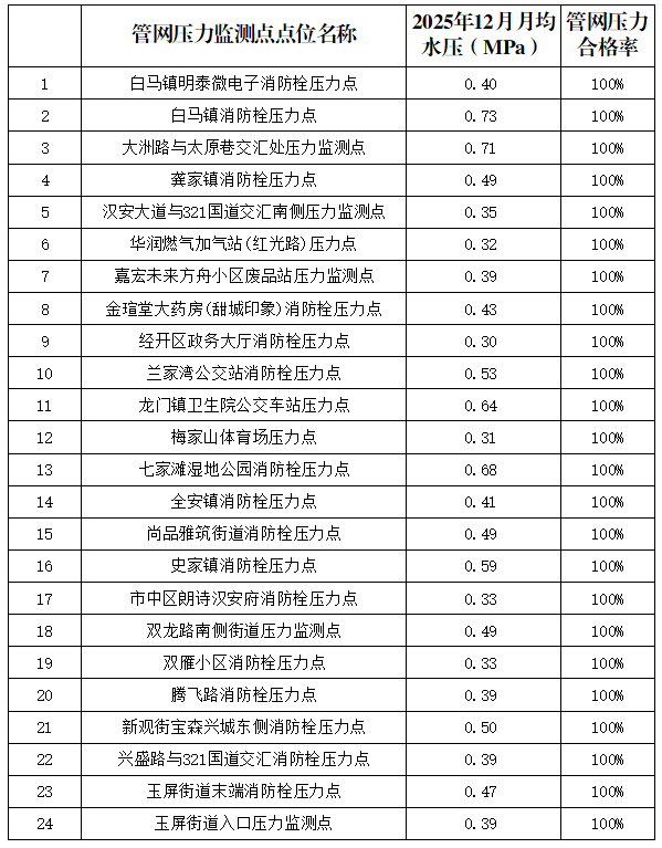內(nèi)江市水務有限責任公司2025年12月管網(wǎng)壓力月報