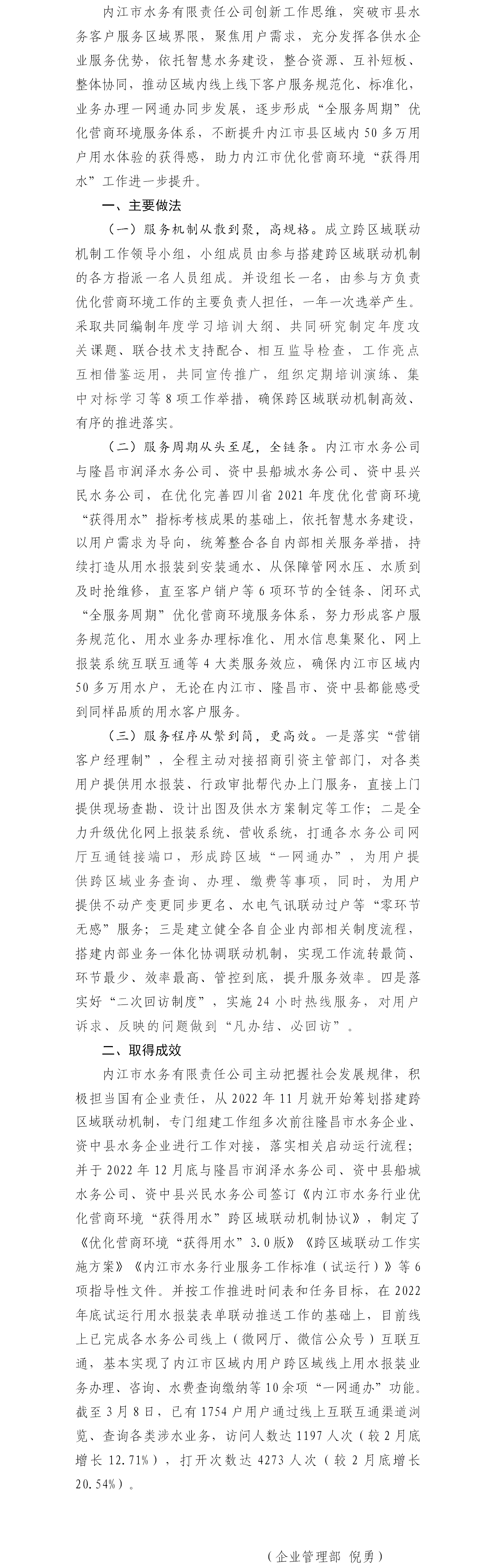 內(nèi)江市啟動水務行業(yè)優(yōu)化營商環(huán)境“獲得用水”跨區(qū)域聯(lián)動機制