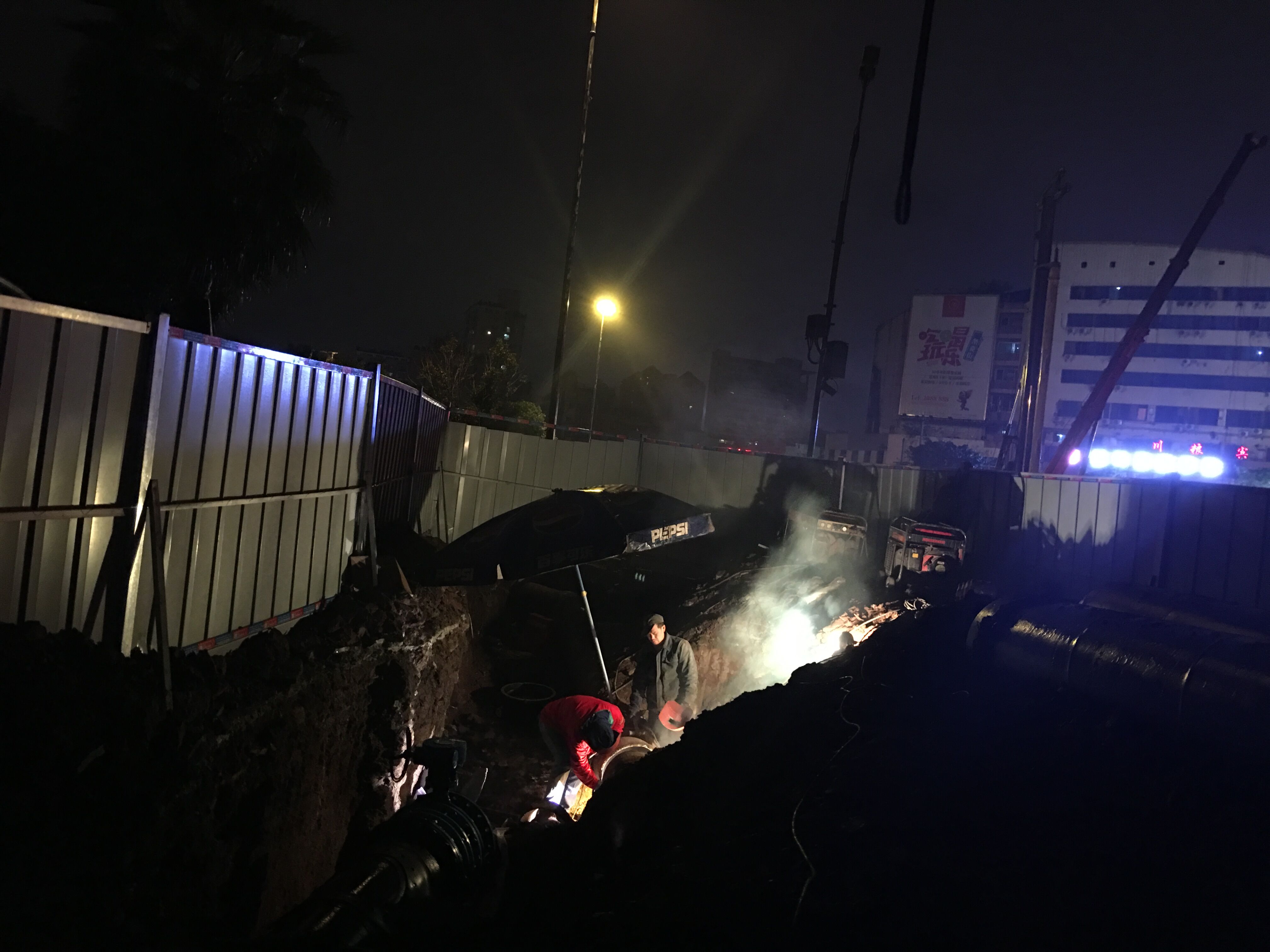 內江市水務有限責任公司為配合西林大橋南北下穿工程順利進行,積極組織豪盛安裝公司、工程管理部、管網運行部等相關部門進行西林大橋南北橋頭下穿DN500給水管道改造。為保證附近居民白天的正常用水,我司特意把工期定在晚上和凌晨。2016年11月22日晚上11點多,陰雨綿綿,寒風刺骨,公司黨委副書記、紀委書記、工會主席李濤帶領黨群工作部提上涼菜、面包和牛奶到施工現場慰問挑燈夜戰、頂風作業的加班人員。他們不畏嚴寒、不知饑餓,只為不影響居民正常生活、保證城市安全供水埋頭苦干的水務人,讓我們不得不心生敬意。