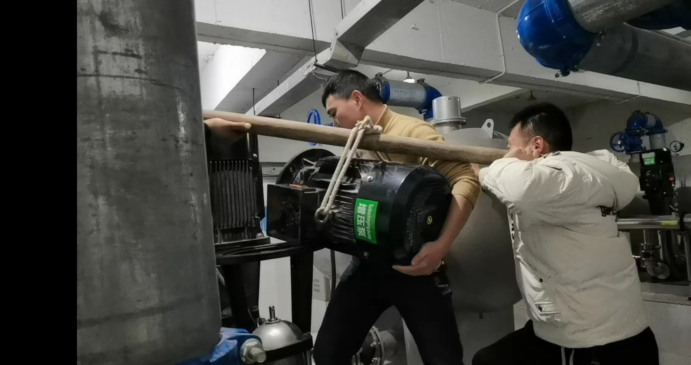 豪鵬公司加大了二次供水泵房的巡檢力度,全力保障各小區的用水安全。近日,在巡檢過程中巡檢人員劉靈漾發現春天公園城小區的水泵運行出現聲音異常,存在安全隱患,維修人員夏旭陽及時趕赴春天公園城小區泵房。經多番細致檢查,發現異響聲音原因來源于泵體內部的葉輪磨損導致,維修人員隨即對泵體內部葉輪進行更換。夏旭陽、劉靈漾將重達300斤的增壓泵抬起、歸位、試機,異響消除 ,安全隱患得以解決。