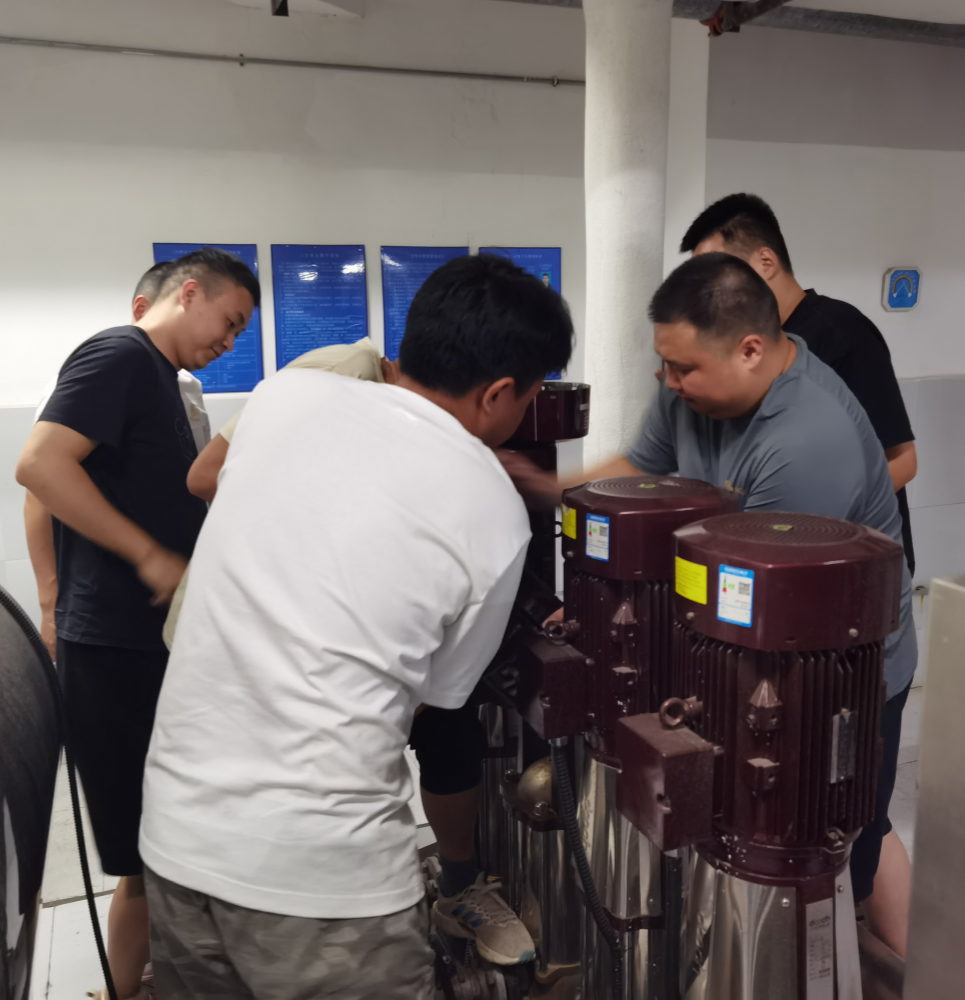 6月中旬,該小區(qū)有用戶反映水壓不穩(wěn)定。豪鵬二次供水公司收到信息立即組織人員前往現(xiàn)場排查,確認(rèn)是一臺水泵電機(jī)出了故障,引發(fā)電壓波動所致。面對突發(fā)情況,公司迅速響應(yīng),立即組織人員對故障電機(jī)進(jìn)行拆解維修。6月17日下午,維修工作進(jìn)入電機(jī)重新安裝的關(guān)鍵階段,公司抓住這次實(shí)戰(zhàn)機(jī)會,組織5名青年員工參與到此次技術(shù)練兵。通過此次培訓(xùn),員工們不僅掌握了電機(jī)維修與安裝的相關(guān)理論和維護(hù)技巧,更在實(shí)戰(zhàn)中深化了對二次供水設(shè)施運(yùn)行原理的理解。