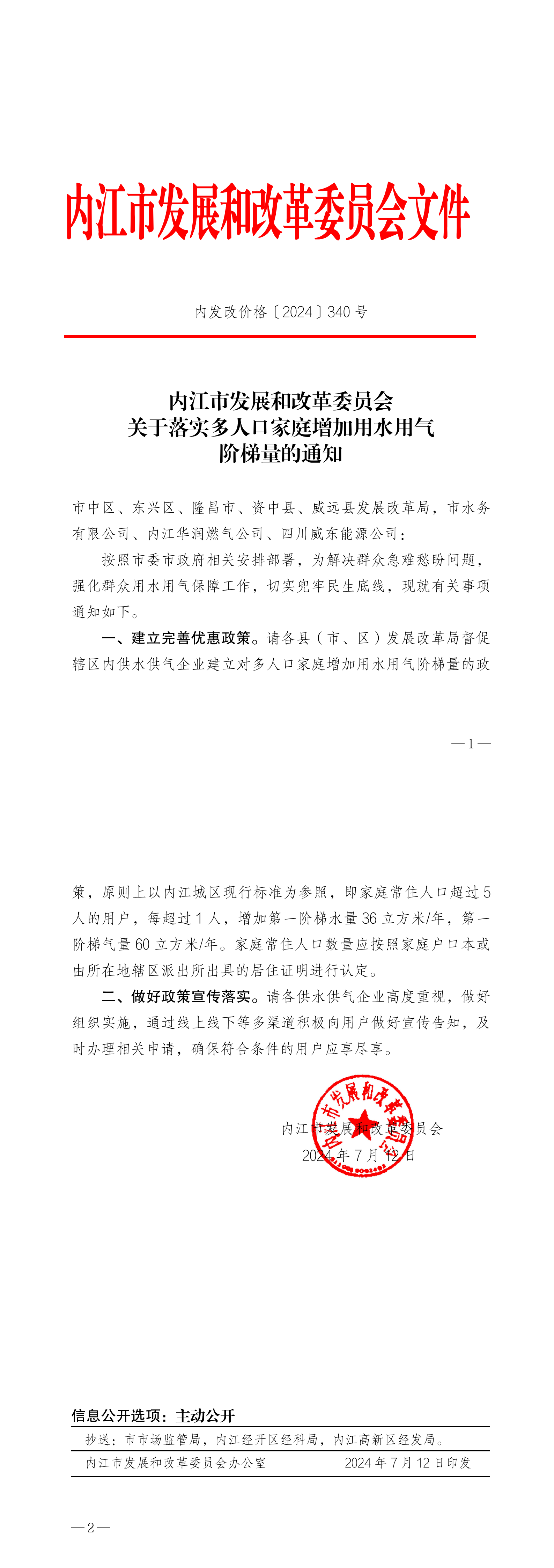 內江市發展和改革委員會關于落實多人口家庭增加用水用氣階梯量的通知